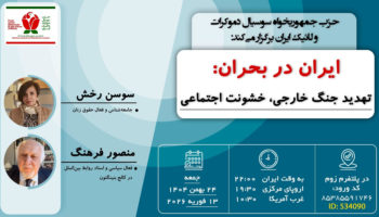 جمعه ها با شما بحث آزاد حزب جمهوریخواه سوسیال دموکرات و لائیک ایران (عضو رسمی جبهه ملی ایران) موضوع: ایران در بحران؛ تهدید جنگ خارجی و خشونت اجتماعی