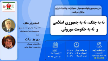 جمعه ها با شما بحث آزاد حزب جمهوریخواه سوسیال دموکرات و لائیک ایران (عضو رسمی جبهه ملی ایران) موضوع: نه به جنگ, نه به جمهوی اسلامی و نه