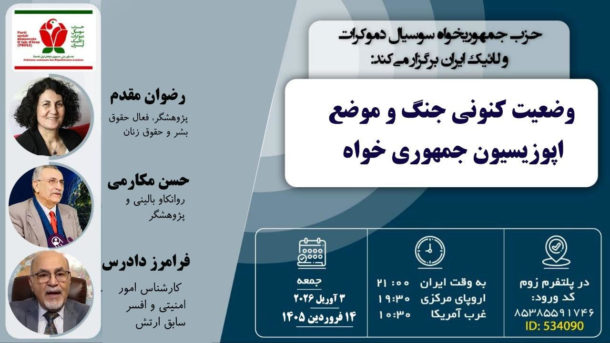جمعه ها با شما بحث آزاد حزب جمهوریخواه سوسیال دموکرات و لائیک ایران (عضو رسمی جبهه ملی ایران) موضوع: وضعیت کنونی جنگ و موضع اپوزیسیون