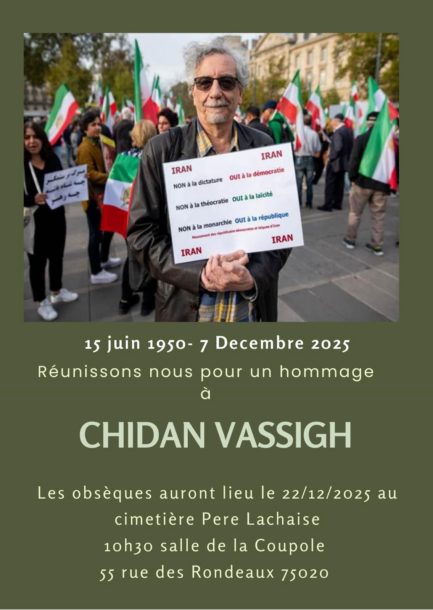 آگهی مراسم زنده یاد شیدان وثیق در روز ۲۲ دسامبر ، ساعت ۱۰،۳۰ در پاریس