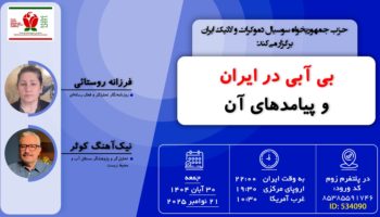 جمعه ها با شما بحث آزاد حزب جمهوریخواه سوسیال دموکرات و لائیک ایران (عضو رسمی جبهه ملی ایران) موضوع: بیآبی در ایران و پیامدهای آن سخنرانان: فرزانه روستایی،